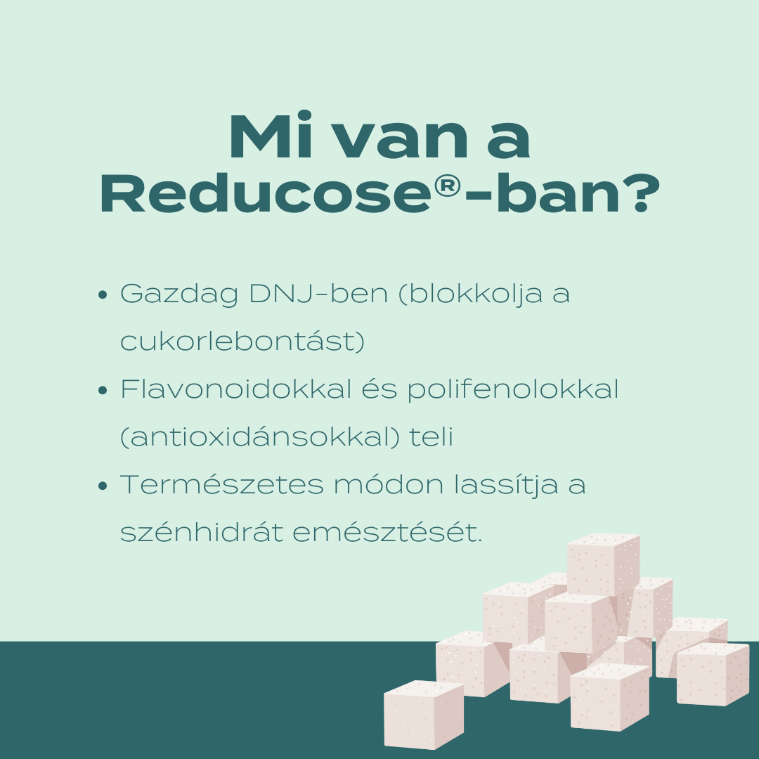 A Reducose® egy természetes eperfa levél kivonat, amelyet az egészséges vércukorszint támogatására terveztek. Úgy működik, hogy lassítja a szénhidrátok felszívódását, ezáltal csökkenti az étkezés utáni vércukorszint-emelkedéseket. Ez 40%-kal alacsonyabb étkezés utáni vércukorszintet és inzulinválaszt eredményezhet.
